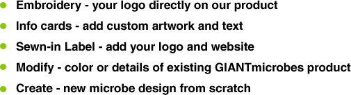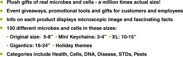 These custom branded GIANTmicrobes plushies are our most popular option for promotions, tradeshows, sales events and other marketing campaigns. We will namedrop, use your logo, contact information, marketing message and add any branded artwork you would like. Select any product from our catalog, and we will add your artwork and information to the permanently attached sewn-in tush tags. Options include: embroider your name or logo on the plushie surface fabric and print our hangtag cards with your logo, artwork and marketing message on the cards (300 words of written copy will fit). This requires new production at our overseas factory, so it takes more time. Select from our active catalog of over 300 GIANTmicrobes products or product designs from our back catalog.