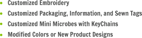 For qualifying orders, we offer the opportunity to take Full Custom one-step further with a few special options: new color materials, revised sizes and small alterations to current designs. For example, you may select one of our blue microbes and make it green, add strings or adjust the eyes. All the same customization options are available: your logo and contact information on the permanent sewn-in tush tags, embroidery on the fabric and revised hangtag cards with your artwork and marketing message. This also requires new production at our overseas factory.