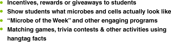 "I love the microbes. I have made it a weekly lesson for kids called Microbe Monday. I made 1-page fact sheets that I give the kids and then I hang the microbes from the ceiling. The kids love it. Tangential science."