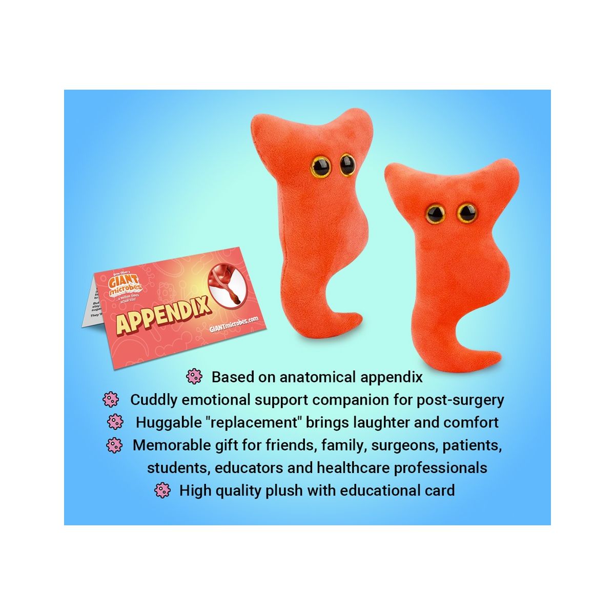 The appendix is a finger-shaped tube sticking out of your colon. It is often considered a “joke organ” with no function. Learn all about this organ with our adorable GIANTmicrobes Appendix plush. Educational, fun and provides emotional support if you are going through the pain of appendicitis.