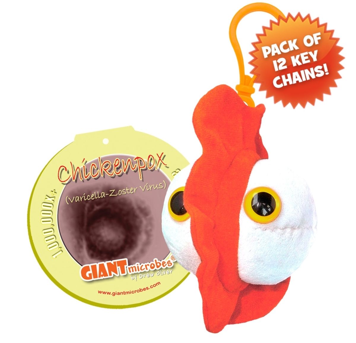 Pack of 12 Chickenpox mini microbes (8cm) with mini-tag and key ring clip.
