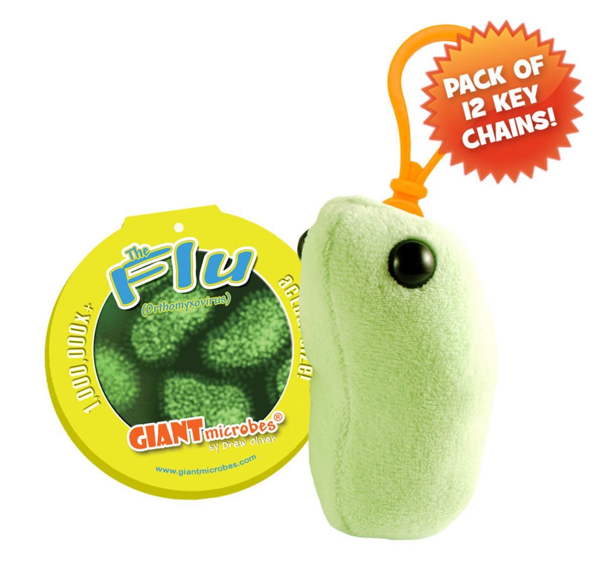 Pack of 12 Flu mini microbes (8cm) with mini-tag and key ring clip.