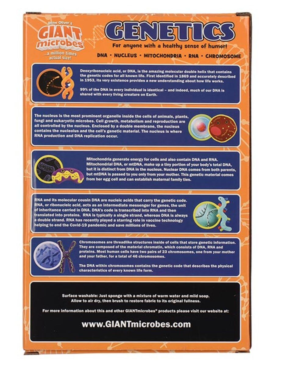 Genetics themed gift box includes these 8cm mini microbe key rings: DNA, Nucleus, Mitochondria, RNA and Chromosome. Educational information on back.