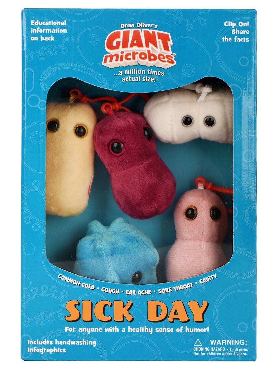 Sick Day themed gift box includes these mini microbes: Common Cold, Cough, Ear Ache, Sore Throat, and Cavity.
