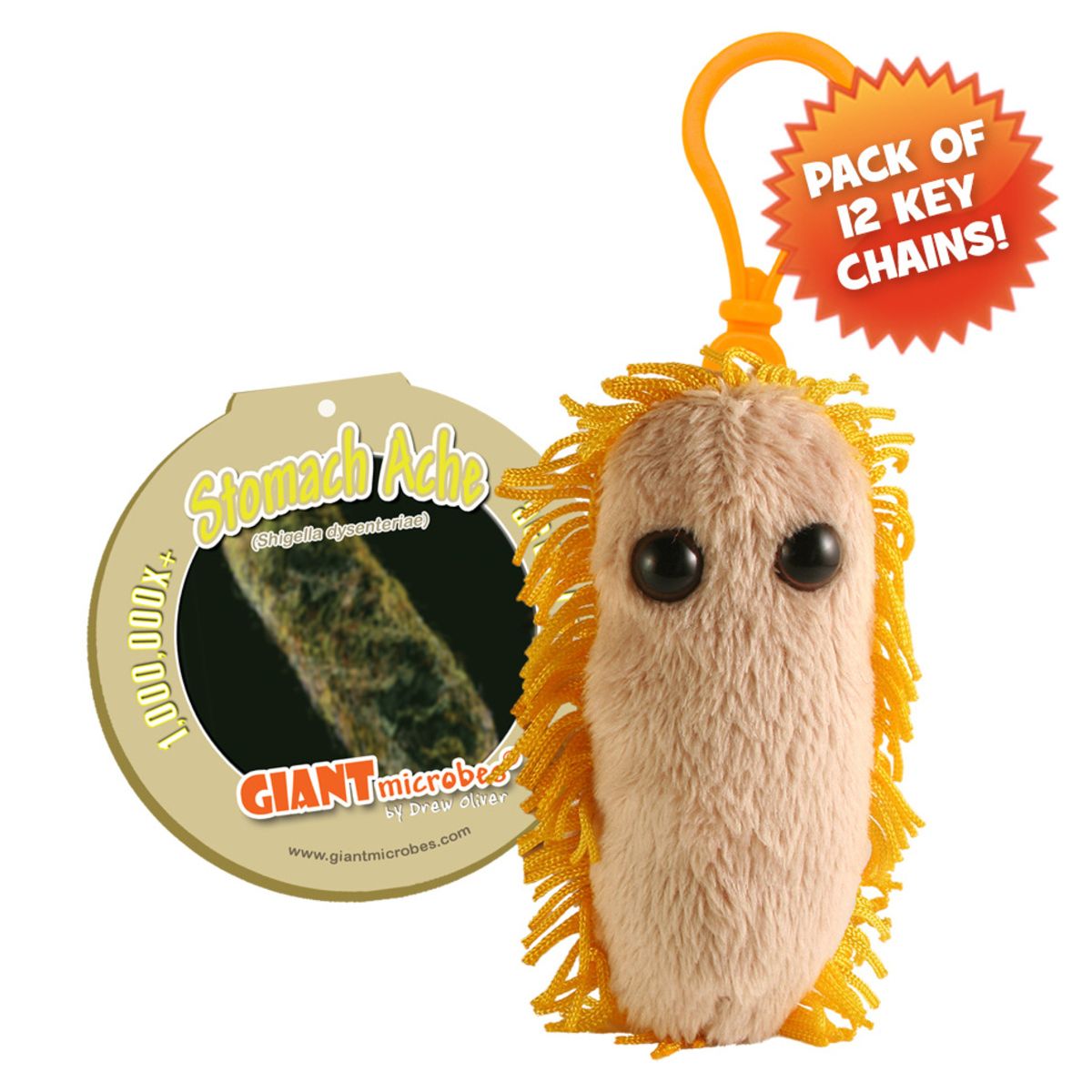 Pack of 12 Stomach Ache mini microbes (8cm) with mini-tag and key ring clip.