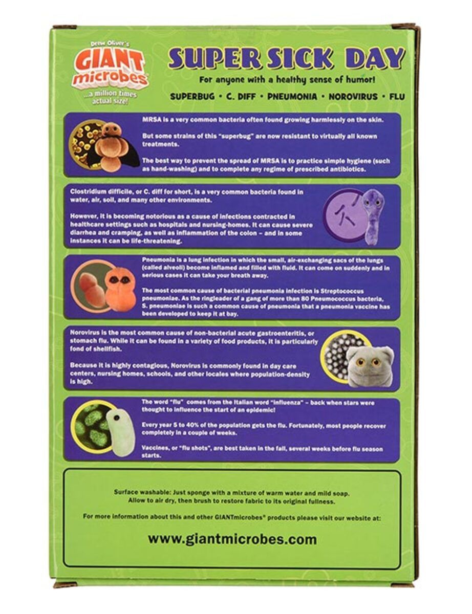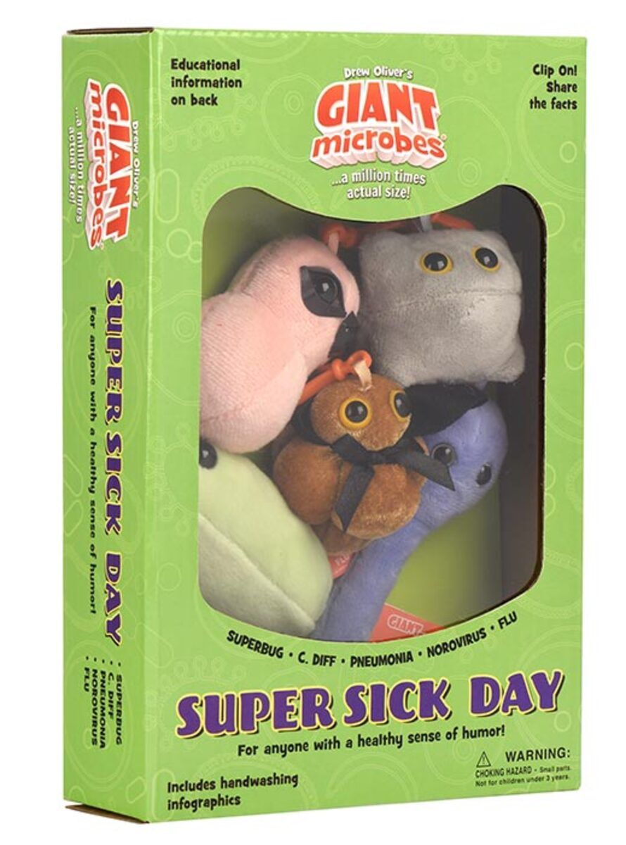Super Sick Day themed gift box includes these mini microbes: MRSA, Pneumonia, Norovirus, Flu and C. Diff.