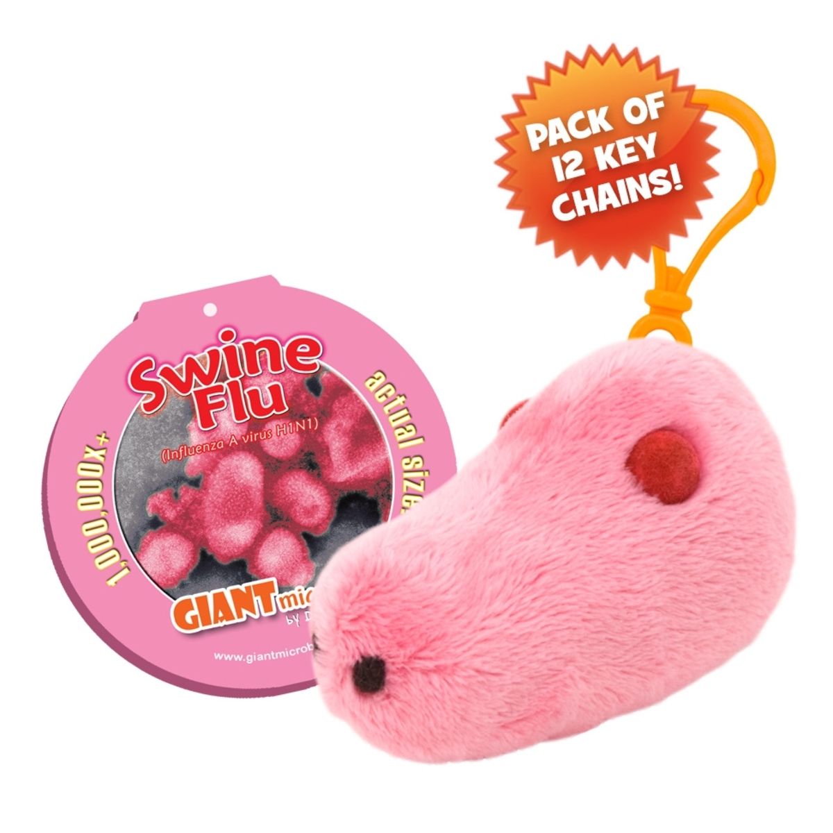 Pack of 12 Swine Flu mini microbes (8cm) with mini-tag and key ring clip.