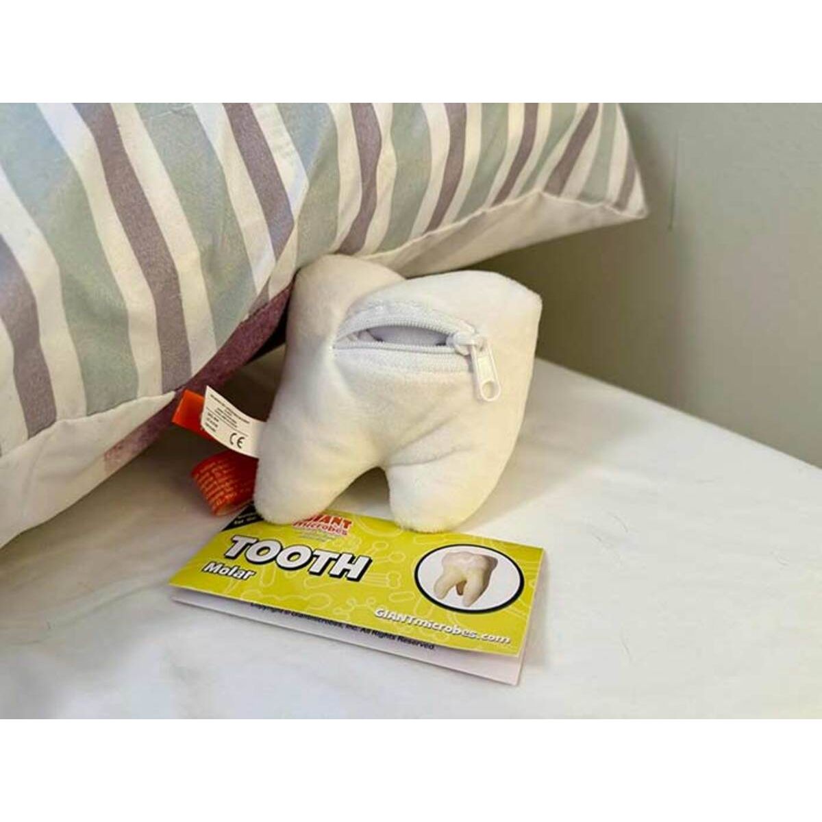 Zippered pocket included! This cuddly tooth has a zippered pocket where your child can put baby teeth for the Tooth Fairy’s visit. Includes an educational card with fun facts about Teeth!