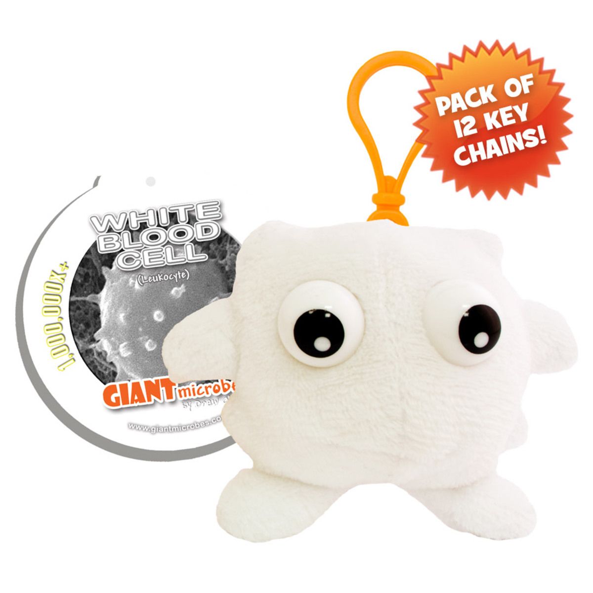 Pack of 12 White Blood Cell mini microbes (8cm) with mini-tag and key ring clip.
