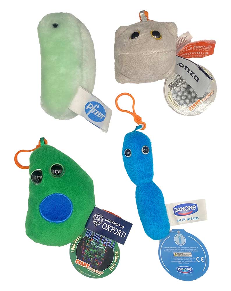 These custom branded GIANTmicrobes plushies are our most popular option for promotions, tradeshows, sales events and other marketing campaigns. We will namedrop, use your logo, contact information, marketing message and add any branded artwork you would like. Select any product from our catalog, and we will add your artwork and information to the permanently attached sewn-in tush tags. Options include: embroider your name or logo on the plushie surface fabric and print our hangtag cards with your logo, artwork and marketing message on the cards (300 words of written copy will fit). This requires new production at our overseas factory, so it takes more time. Select from our active catalog of over 300 GIANTmicrobes products or product designs from our back catalog.