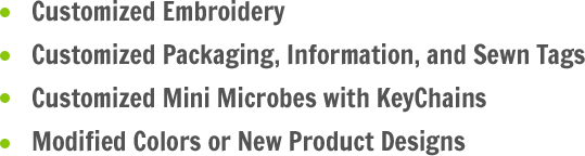 For qualifying orders, we offer the opportunity to take Full Custom one-step further with a few special options: new color materials, revised sizes and small alterations to current designs. For example, you may select one of our blue microbes and make it green, add strings or adjust the eyes. All the same customization options are available: your logo and contact information on the permanent sewn-in tush tags, embroidery on the fabric and revised hangtag cards with your artwork and marketing message. This also requires new production at our overseas factory.
