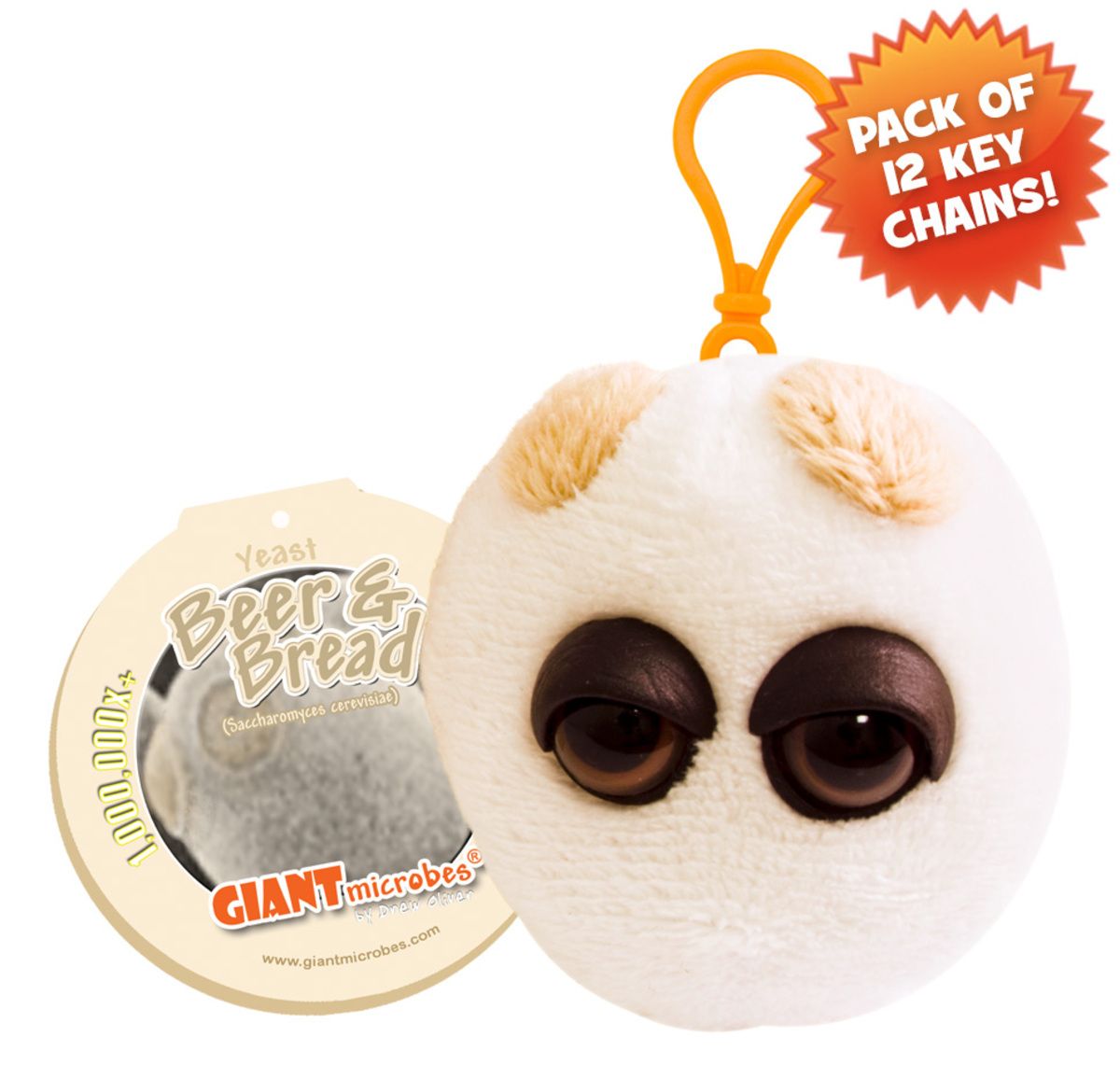 Pack of 12 Beer & Bread mini microbes (3") with mini-tag and key chain clip.