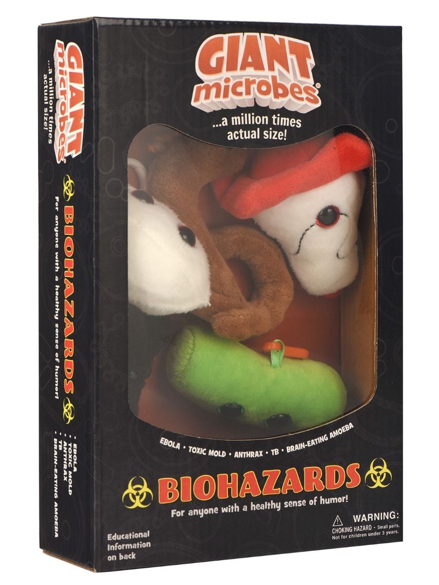 Biohazards themed gift box includes these mini microbes: Ebola, Toxic Mold, Anthrax, TB, and Brain-Eating Amoeba.
