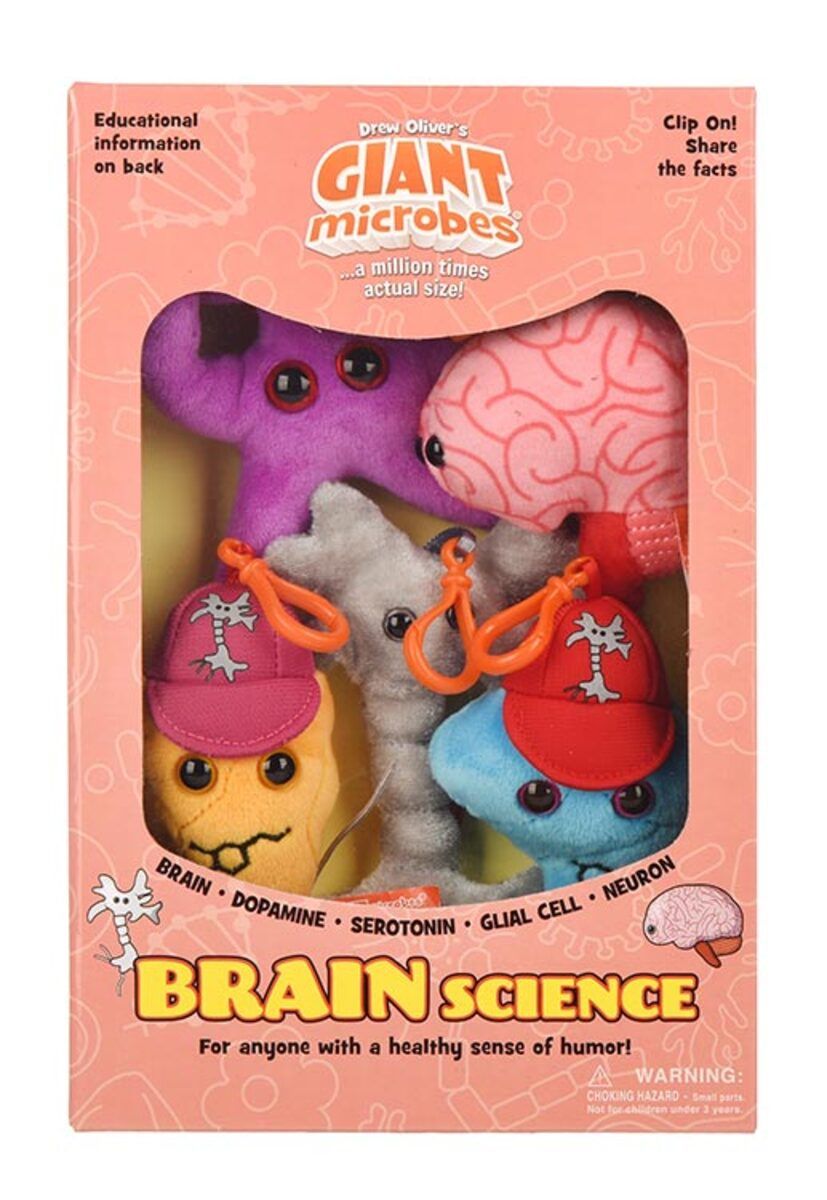 Brain Science themed gift box includes these 3" mini microbe key chains: Brain, Dopamine, Serotonin, Glial Cell and Neuron. Educational information on back.