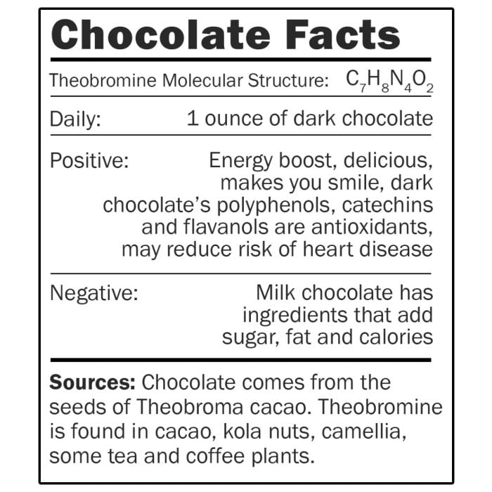 For most of its long history, chocolate was drunk, not eaten. The Olmec, Mayan and Aztec peoples turned cacao into a thick unsweetened drink. They also used the bean as currency. In the 1600s, the Spanish recognized cacao as a precious commodity and shipped it to Europe, where sweetened chocolate became a popular drink and chocolate houses sprang up as meeting places. Solid chocolate was not eaten until the 1800s when the English made the first chocolate bar. The next time you crave the gastronomical gift of chocolate, consider the wonderous journey of cacao and the science of theobromine. That is food for thought.