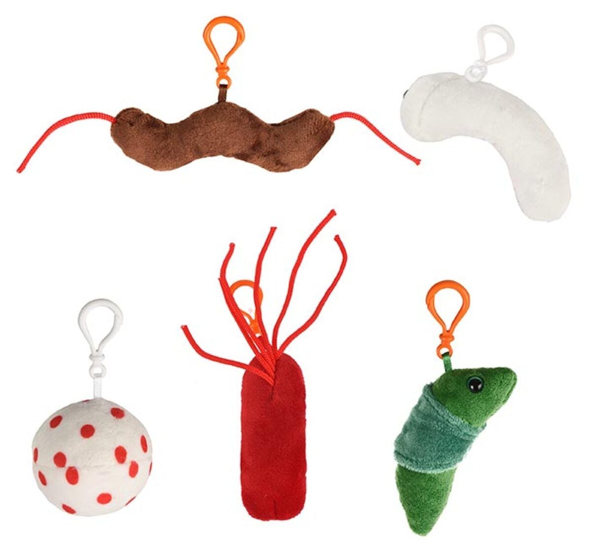 This educational 5-piece pack includes these mini microbes with key chain clips: Dysentery, Typhoid Fever, Measles, Malaria and Pus (representing lethal infections).