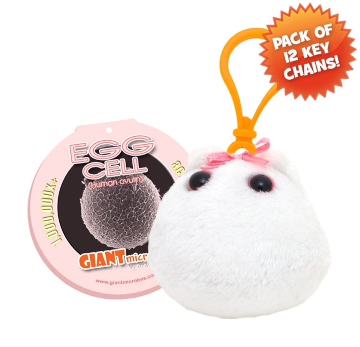 Pack of 12 Egg Cell mini microbes (3") with mini-tag and key chain clip.