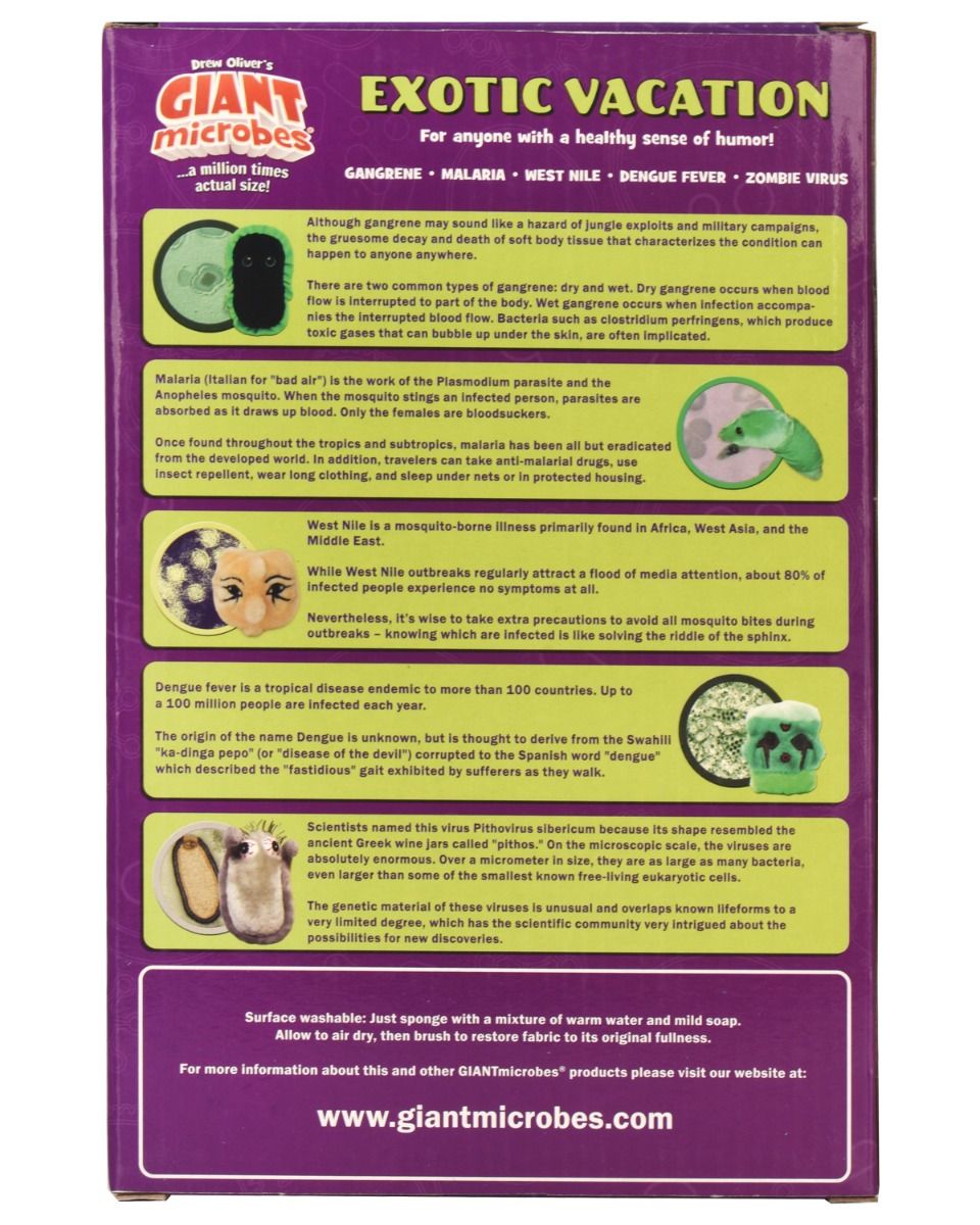 Exotic Vacation themed gift box includes these mini microbes: Gangrene, Malaria, West Nile, Dengue Fever, and Zombie Virus.
