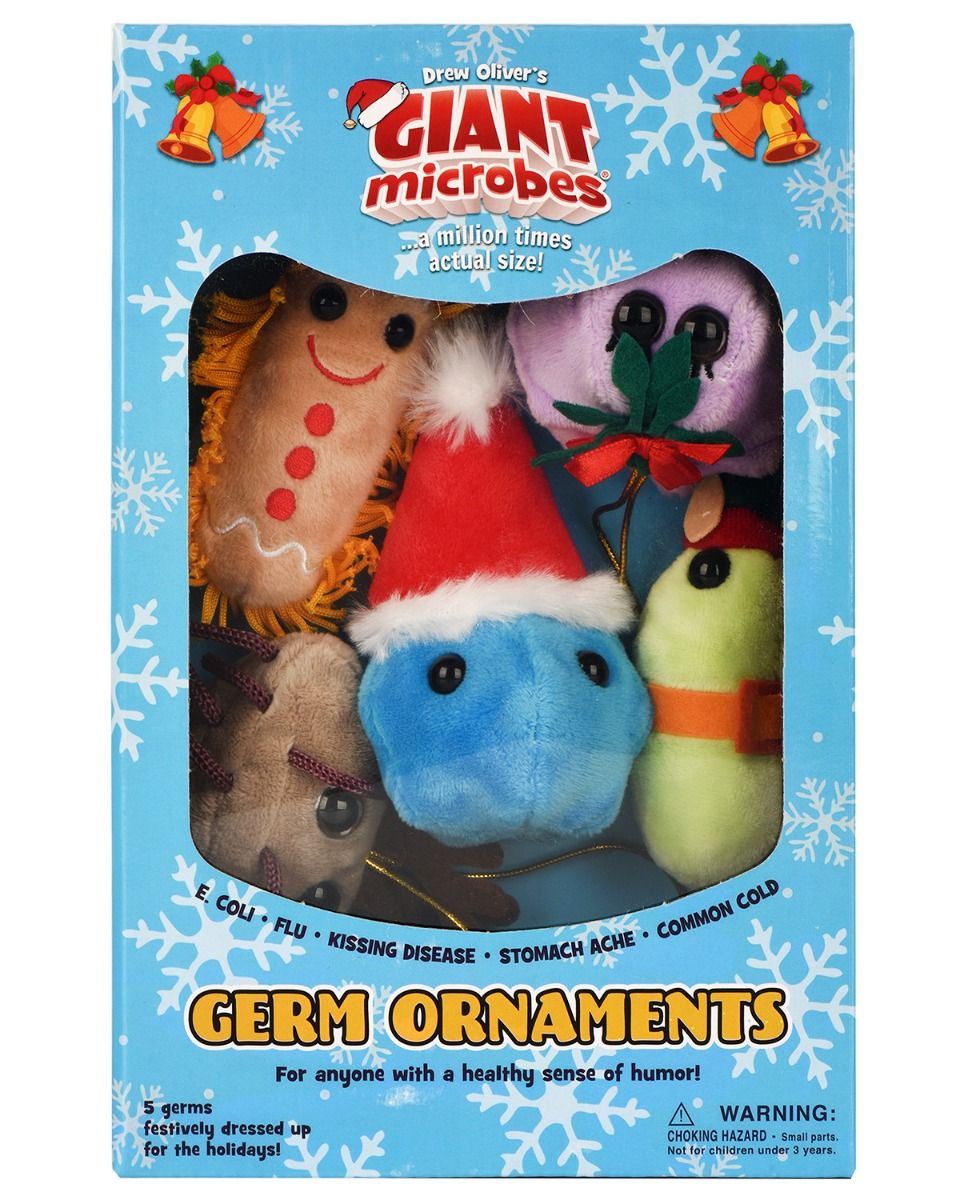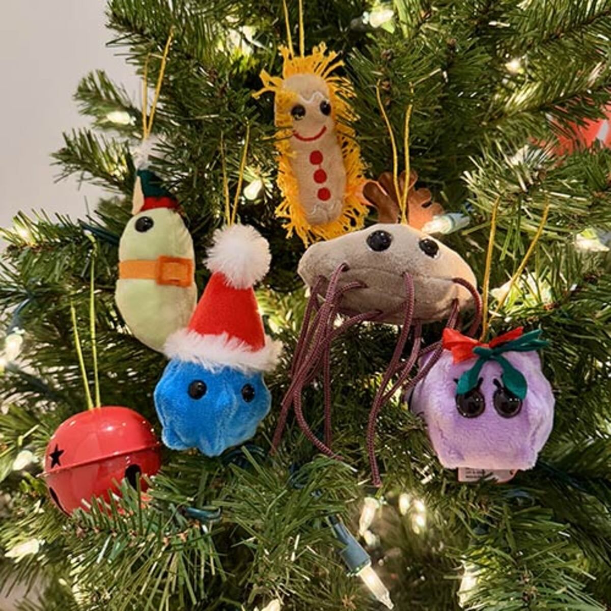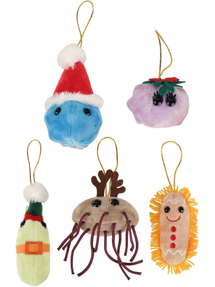 5 germs festively dressed up for the holidays! Decorate your tree or house with these memorable special edition microbes with golden loops for hanging.