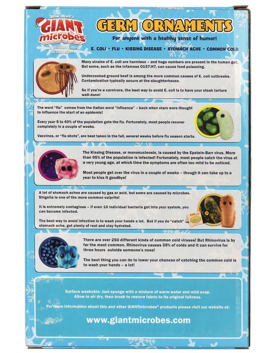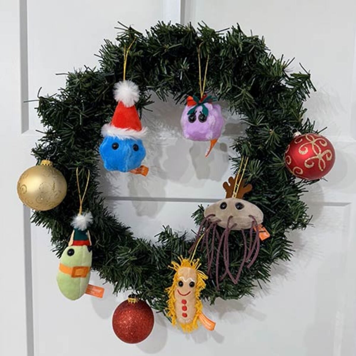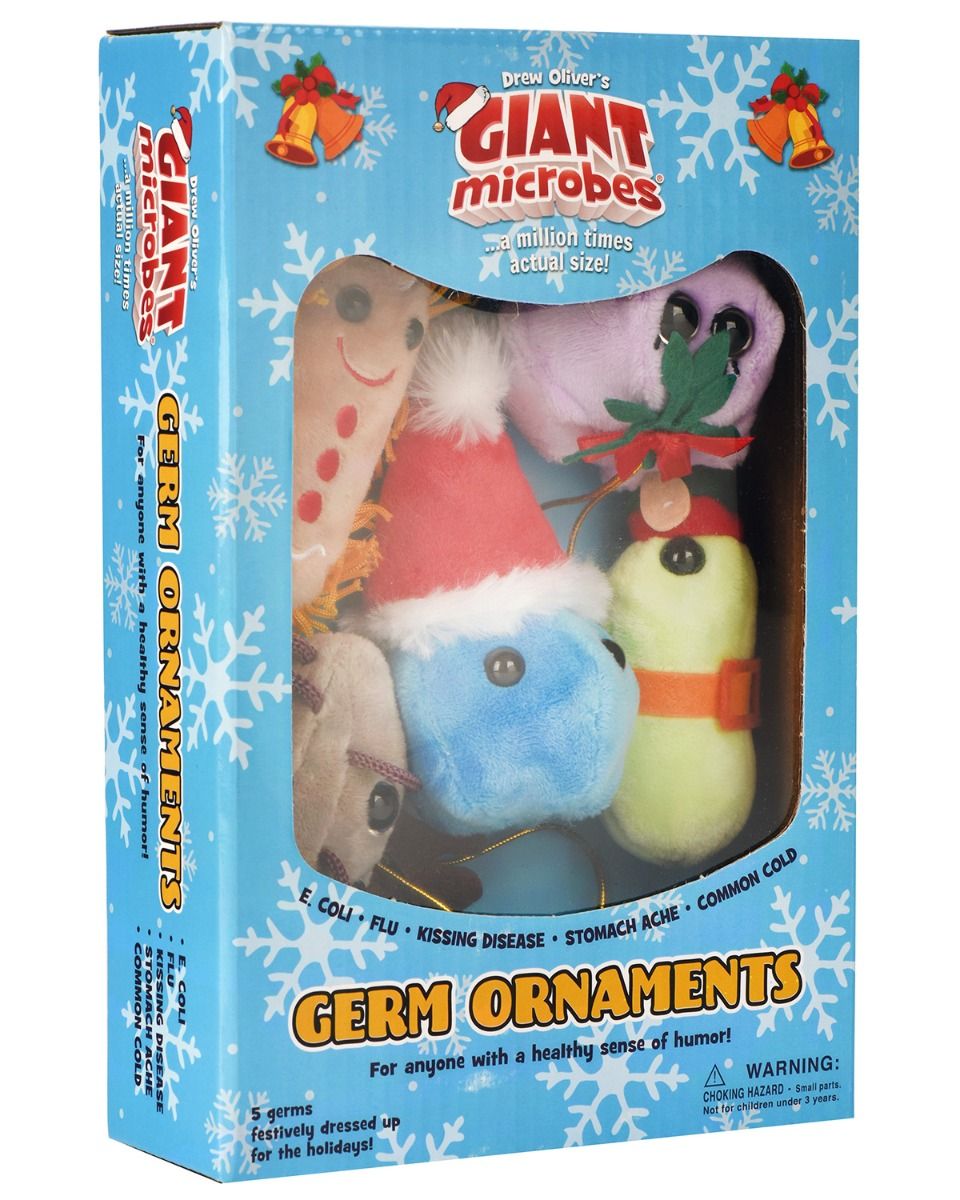 5 germs festively dressed up for the holidays! Decorate your tree or house with these memorable special edition microbes with golden loops for hanging.