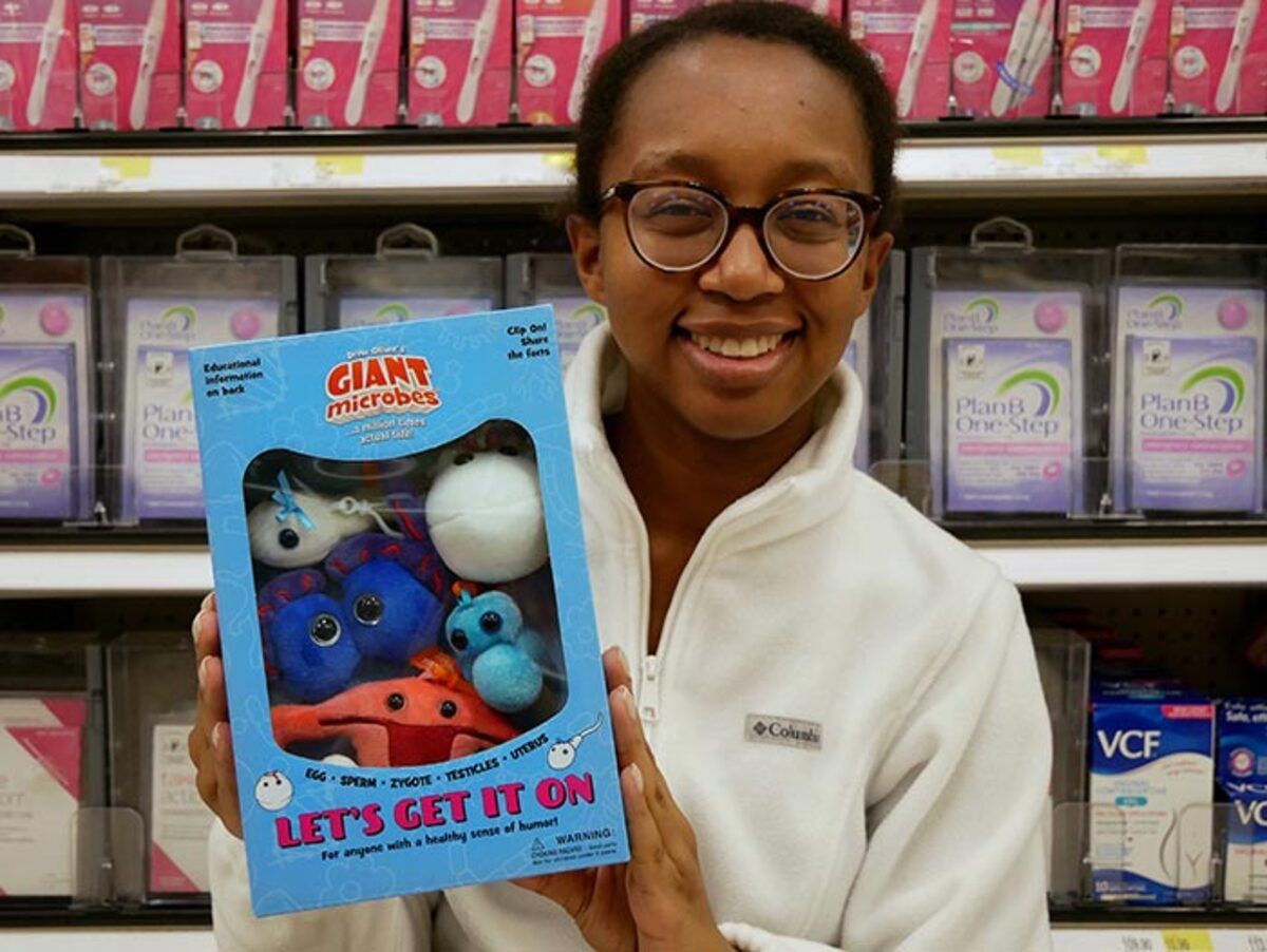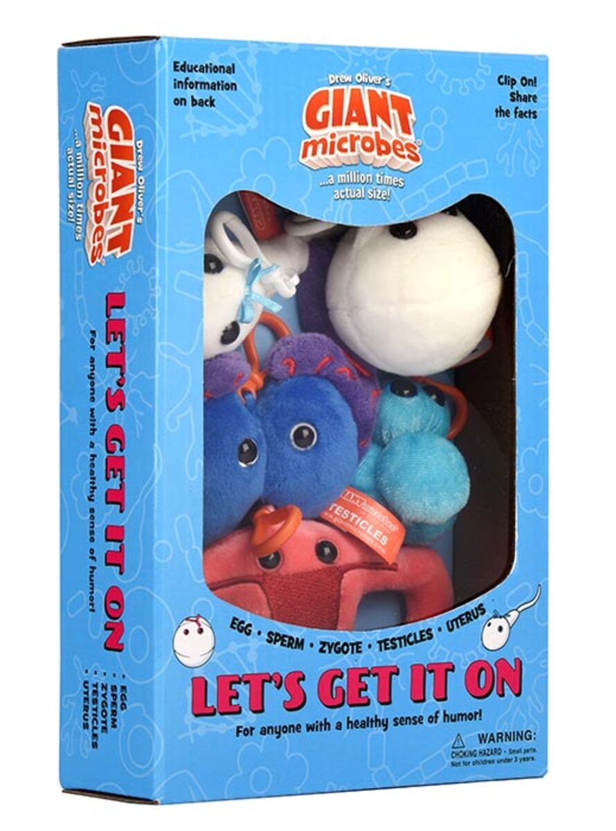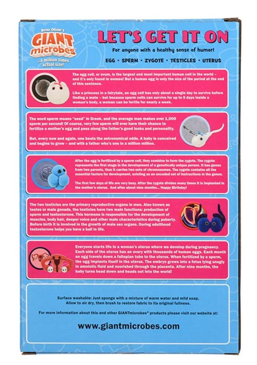 Let's Get It On themed gift box includes these mini microbes: Egg Cell, Sperm Cell, Zygote, Testicles and Uterus.