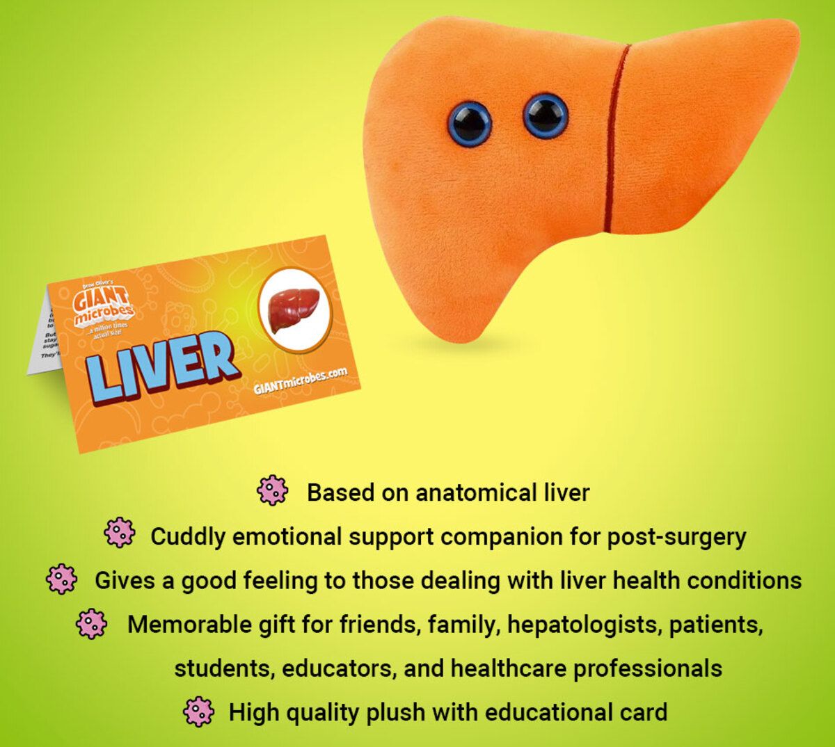This adorable plush representation of the human Liver provides a fun, hands-on-way to learn about health and your largest internal organ and its critically important functions. Our Liver is super loveable, cuddly and makes the most memorable get well gift for loved ones post surgery or illness.