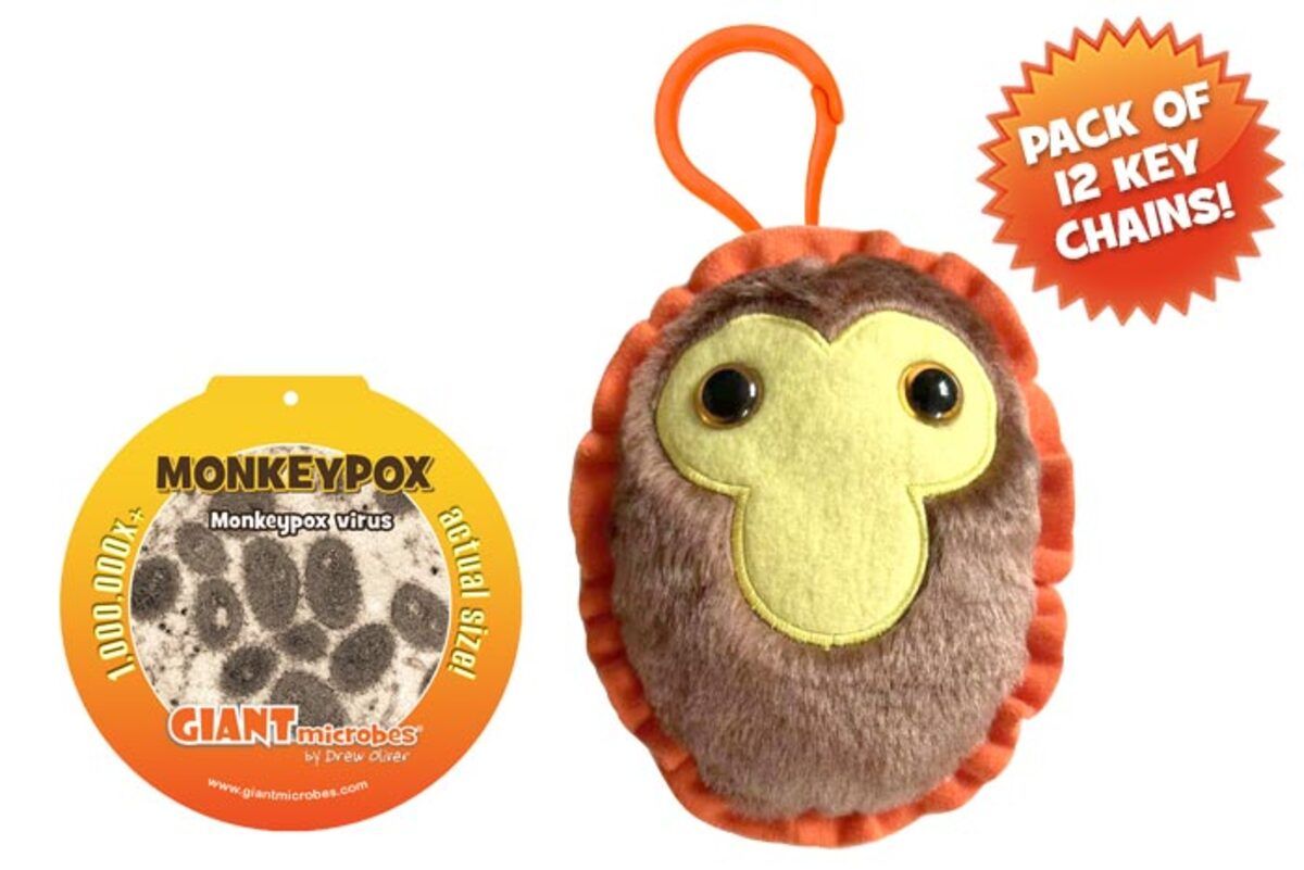 Pack of 12 Monkeypox mini microbes (3") with mini-tag and key chain clip.