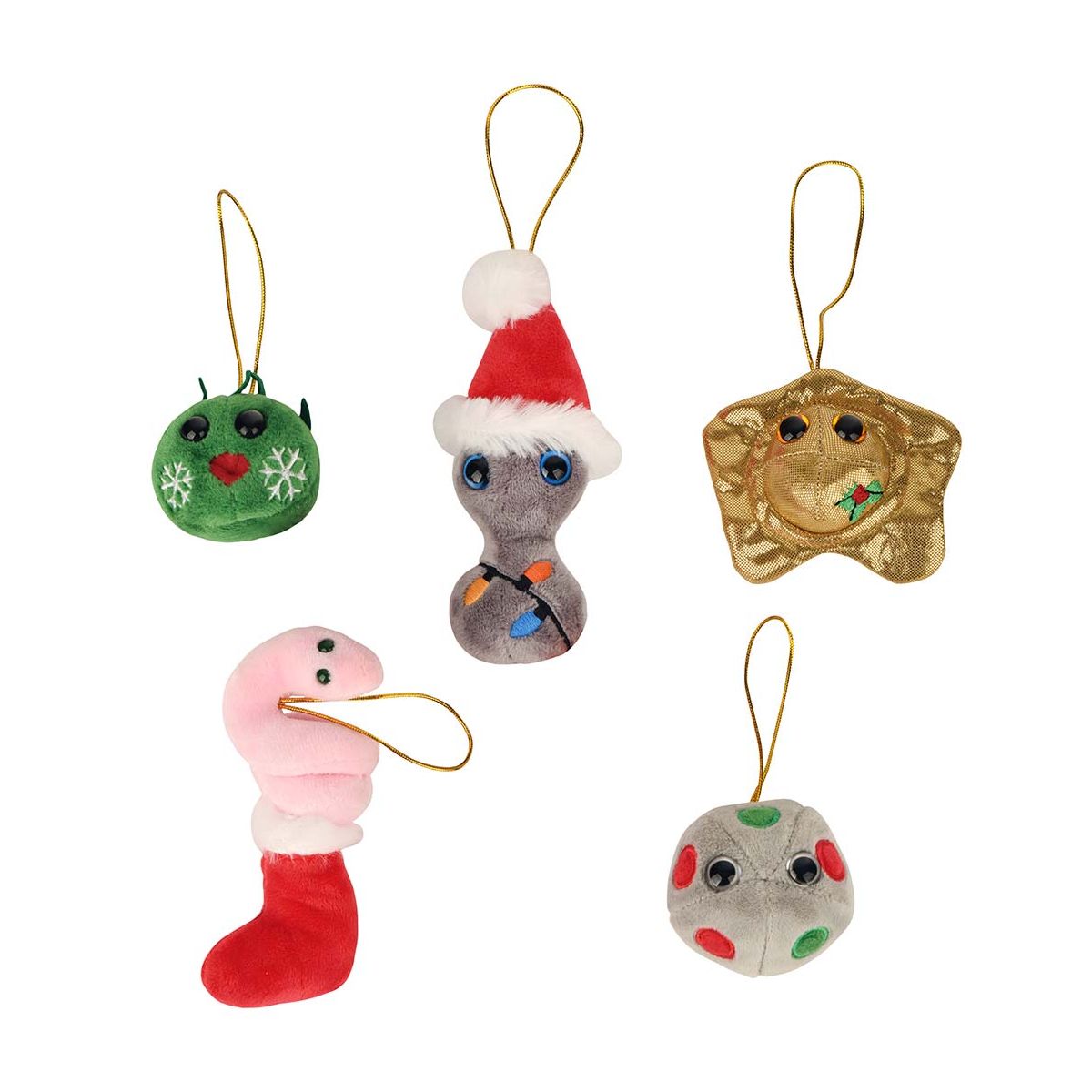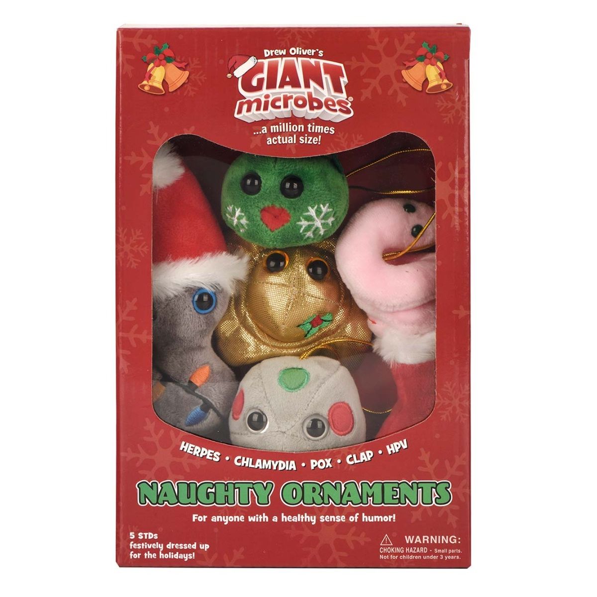 5 STDs festively dressed up for the holidays! Decorate your tree or house with these memorable special edition microbes with golden loops for hanging.