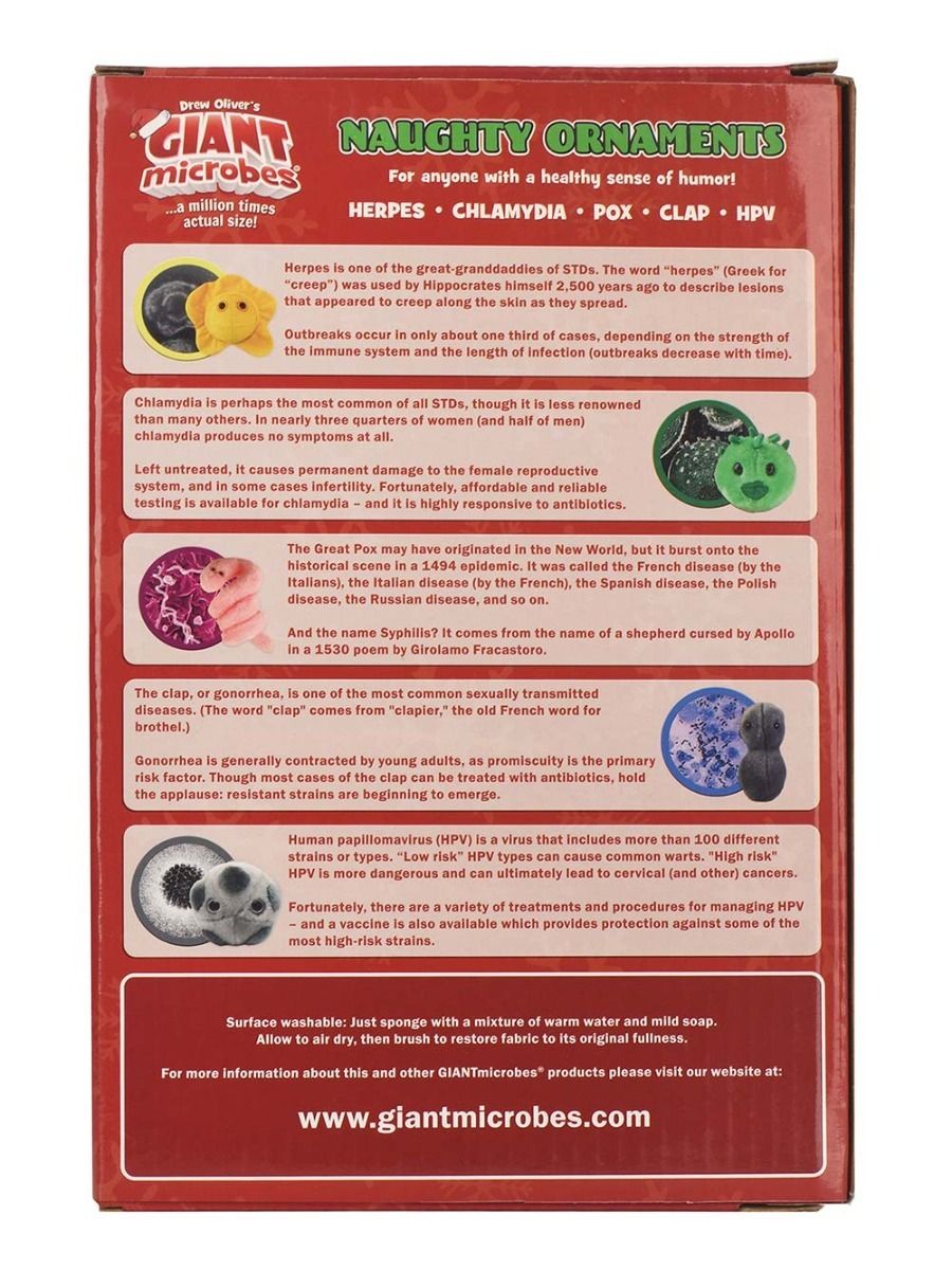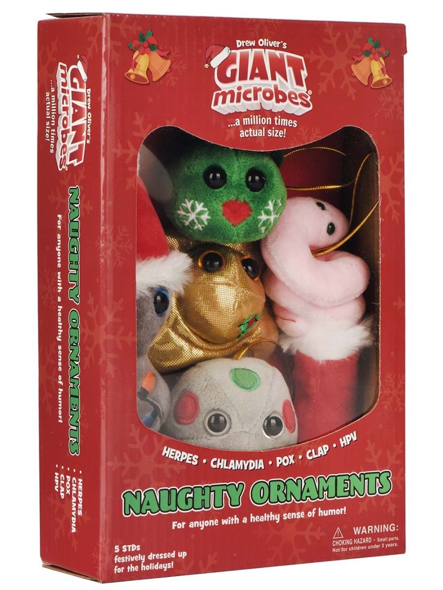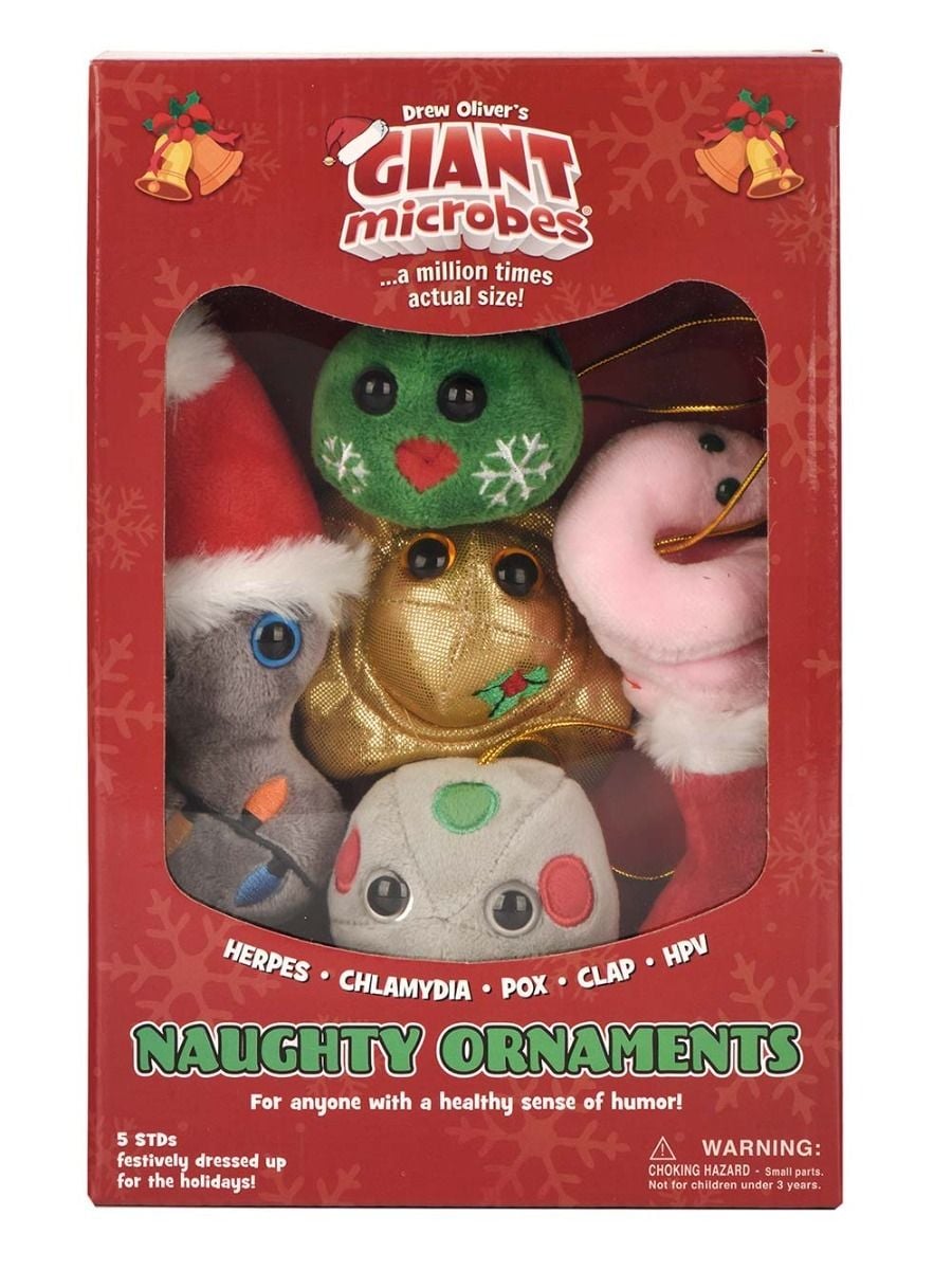 Get ready to spice up your holiday decor with science and sass. Our Naughty Ornaments collection features STI-themed, adult-humor plush ornaments (Herpes, Chlamydia, Pox, Clap and HPV) packaged in a colorful, festive gift box. These cheeky, conversation-starting ornaments are the perfect funny holiday gifts, gag gifts for healthcare workers, or tongue-in-cheek additions to your tree.