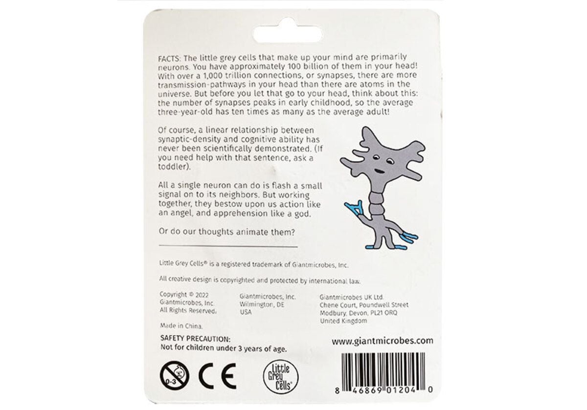 Little Grey Cells® are intelligence-based products designed to amuse and educate. This adorable neuron will have you thinking about your brain cells and how they work together to make you who you are. Excellent gift for students, teachers, scientists, doctors and any lover of brains and minds. A unique gift that will never be forgotten.