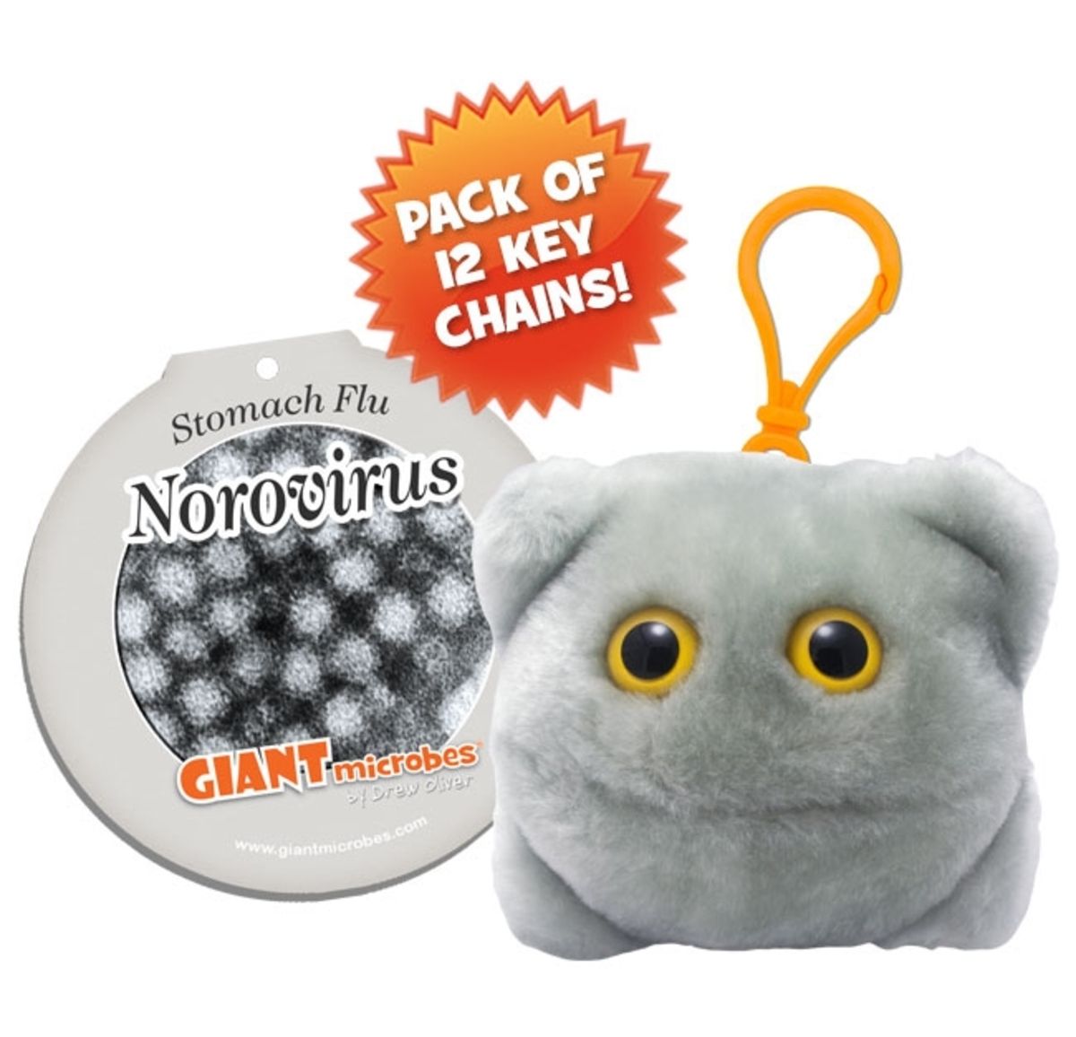 Pack of 12 Norovirus mini microbes (3") with mini-tag and key chain clip.