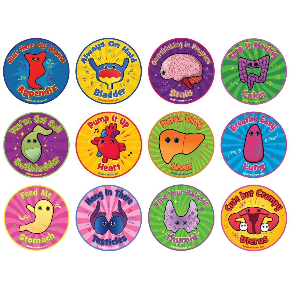 Celebrate your guts, brains, and everything in between with this hilarious sticker pack! This Organs Sticker 12-Pack features 12 full-color vinyl stickers, each showcasing a vital organ with a clever saying and cartoon-style illustration.