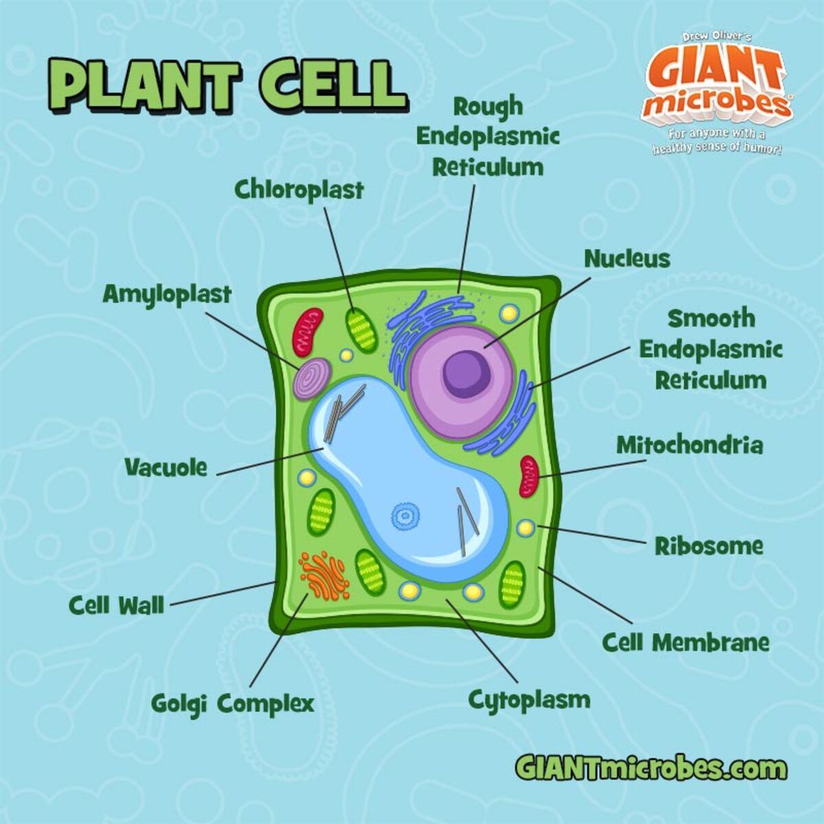 Memorable and educational, this colorful representation of the plant cell highlights over 10 organelles: cell membrane, cell wall, chloroplast, vacuole, nucleus, rough and smooth endoplasmic reticulum, golgi apparatus, ribosome and mitochondria.