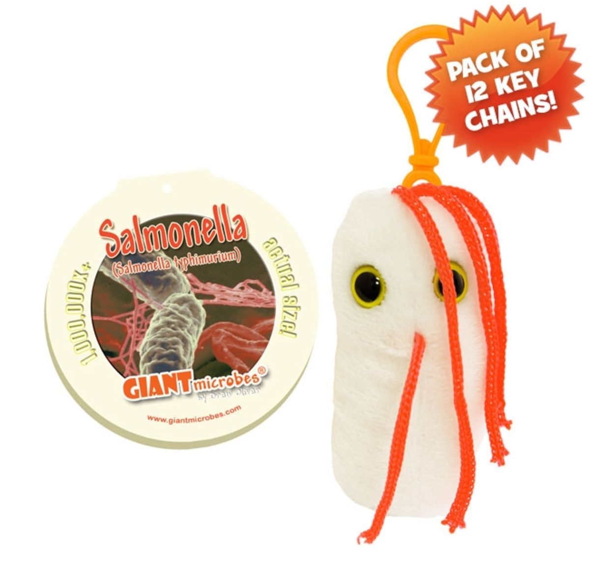 Pack of 12 Salmonella mini microbes (3") with mini-tag and key chain clip.