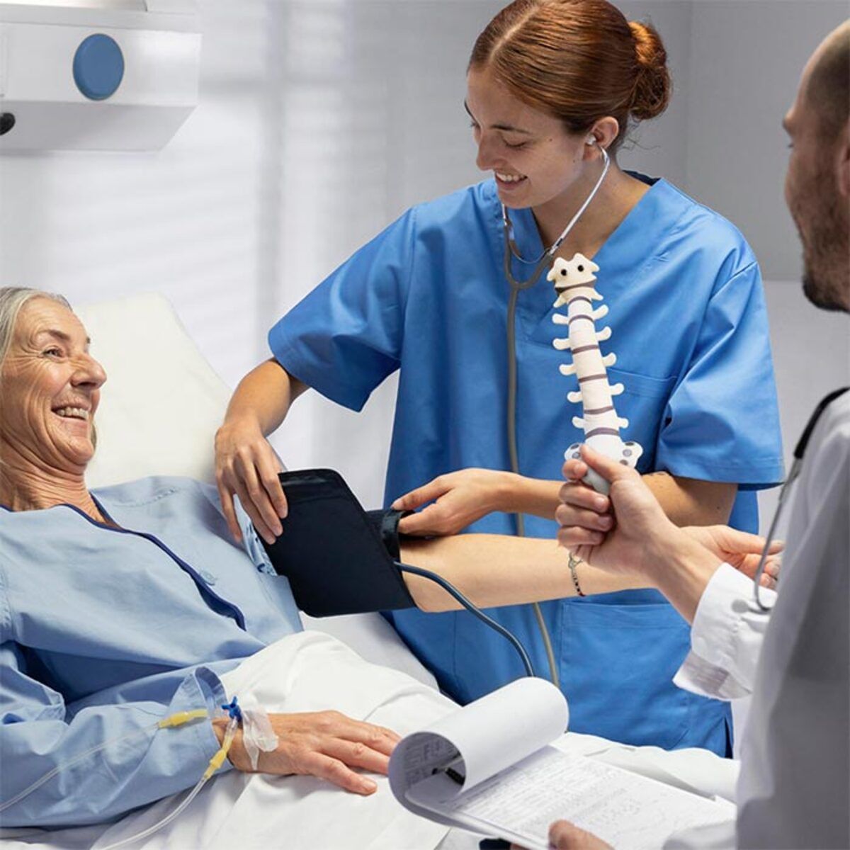 GIANTmicrobes plush Spine features 7 vertebrae representing the vertebral column with dark grey discs in between. At the bottom is the sacrum and coccyx, or tailbone, with detailed grey embroidery.