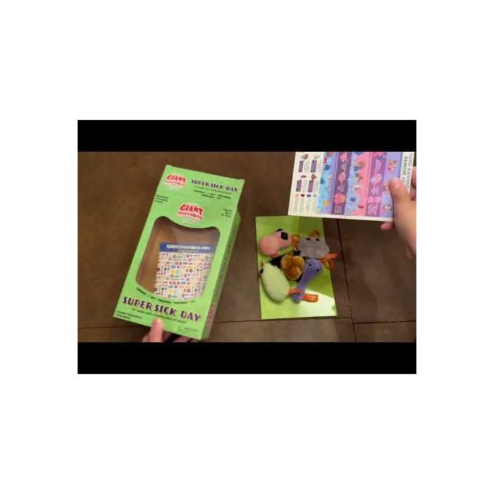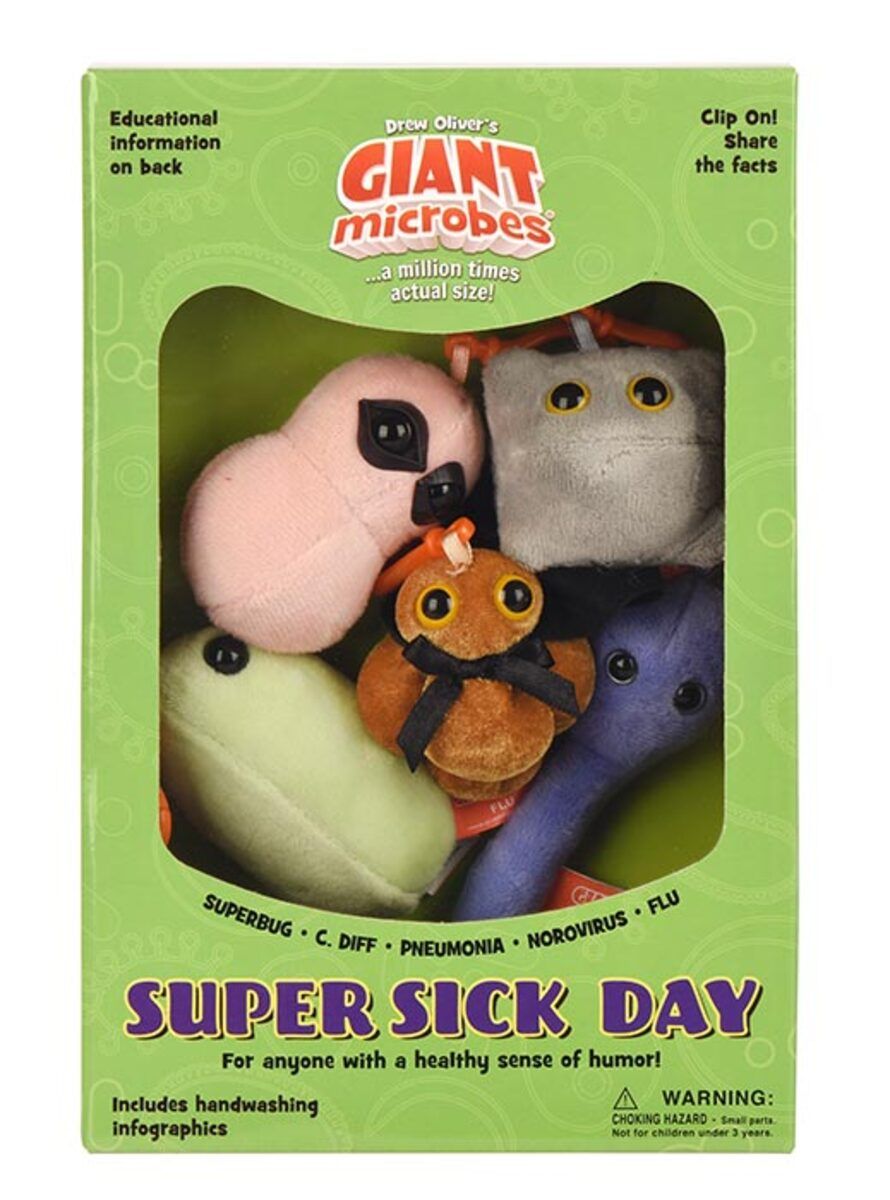 Super Sick Day themed gift box includes these mini microbes: MRSA, Pneumonia, Norovirus, Flu and C. Diff.