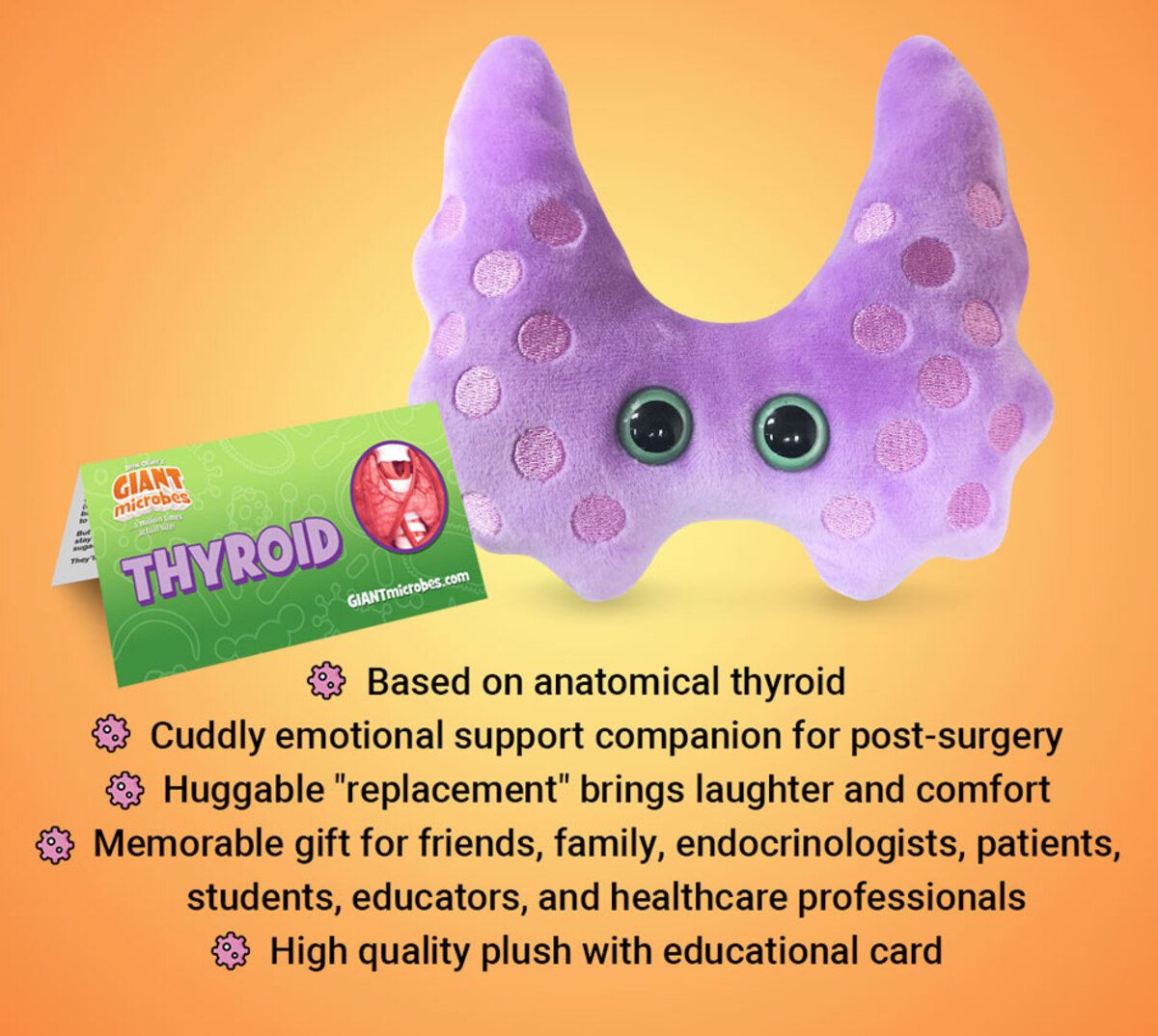 This adorable plush representation of a human thyroid provides a fun hands-on way to learn about your glands, endocrine system, anatomy and biology. GIANTmicrobes Thyroid is soft, cuddly and makes the most memorable get well gift for loved one's post-surgery.
